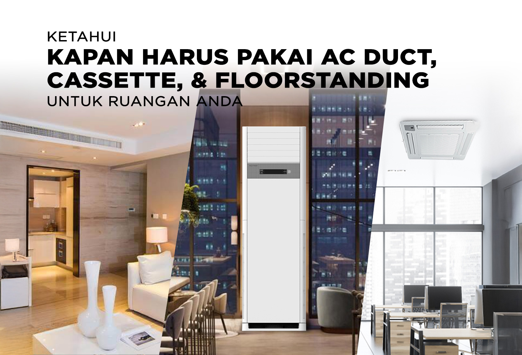 Kesimpulan Pemilihan tipe AC harus mempertimbangkan lebih dari sekadar kapasitas, melainkan juga fungsi ruang, estetika interior, serta efisiensi energi. • AC Duct cocok untuk properti besar elegan dengan distribusi udara tersembunyi ke banyak ruang. • AC Cassette ideal untuk area komersial modern yang mengedepankan plafon rapi dan kesejukan merata seperti restoran atau toko. • AC Floor Standing terbaik untuk ruang luas atau keramaian, dengan hembusan kuat dan instalasi mudah.